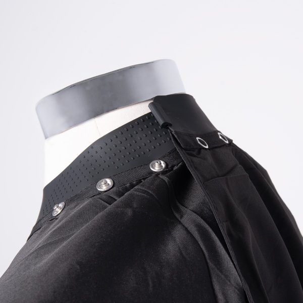 La ligereza del poliéster y el sistema de cierre de corchete garantizan una colocación rápida y segura. El cuello de silicona mantiene la capa firme sin dejar pasar humedad ni cabellos, ofreciendo confort incluso durante sesiones largas de corte o coloración. Ideal para mantener el ritmo de trabajo fluido en barberías con alta rotación de clientes.