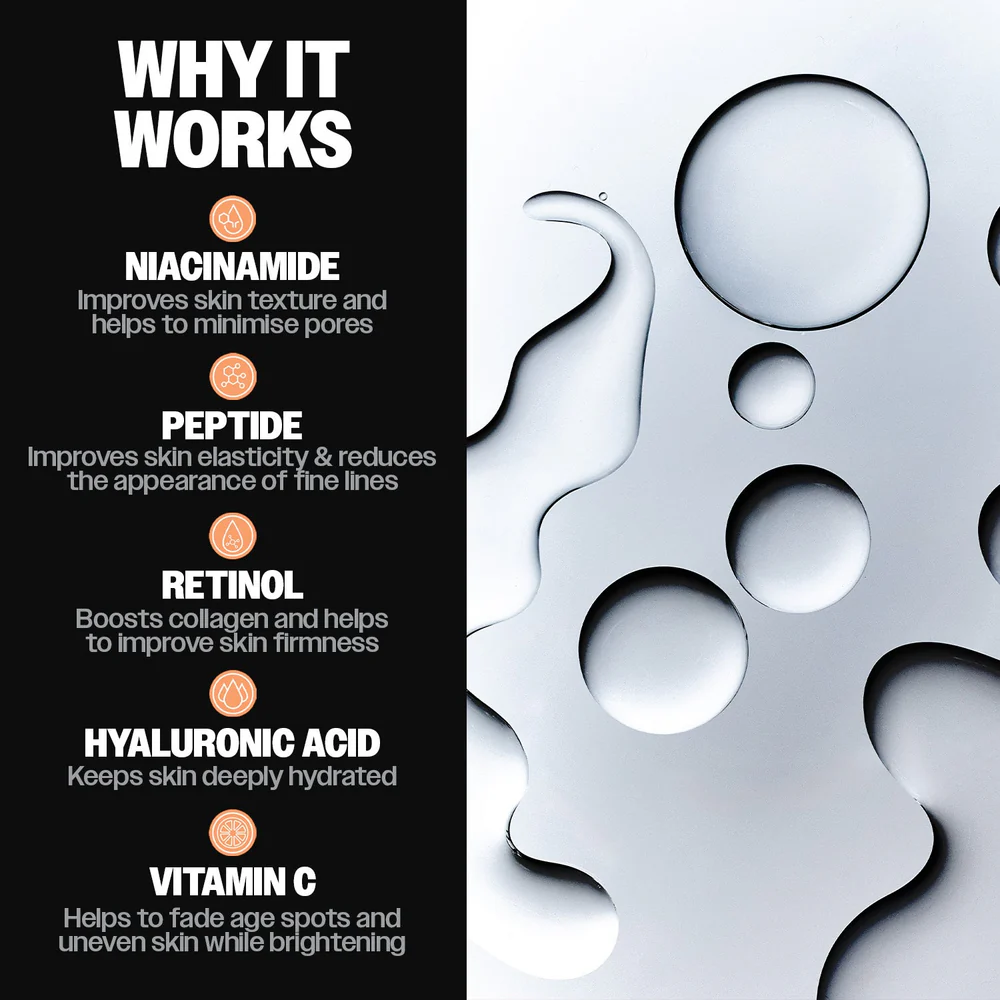 - Activos destacados: Niacinamida, retinol encapsulado, ácido hialurónico, vitamina C y Tripeptide-29