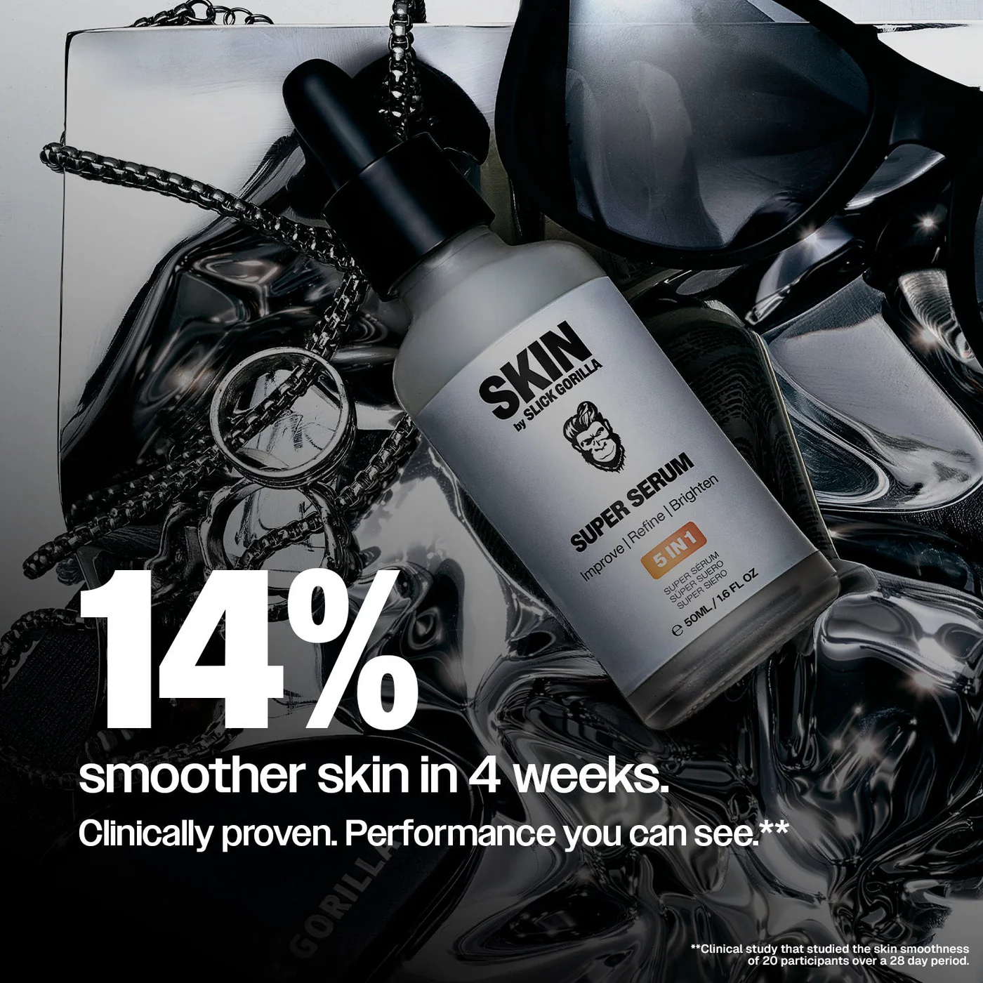 Super Serum Slick Gorilla sérum facial 5 en 1 es un sérum de uso diario pensado para tratar varias necesidades de la piel en un solo paso. Su fórmula con niacinamida, retinol encapsulado, ácido hialurónico, vitamina C y Tripeptide-29 ayuda a equilibrar el exceso de grasa, hidratar, mejorar la textura, iluminar el tono apagado y suavizar la apariencia de líneas finas. Gracias a su textura ligera, rápida absorción y acabado sin brillo ni residuo graso, encaja muy bien en barbería como producto de cuidado facial fácil de recomendar, con alto valor percibido y una propuesta clara para clientes que buscan una rutina eficaz y sencilla.